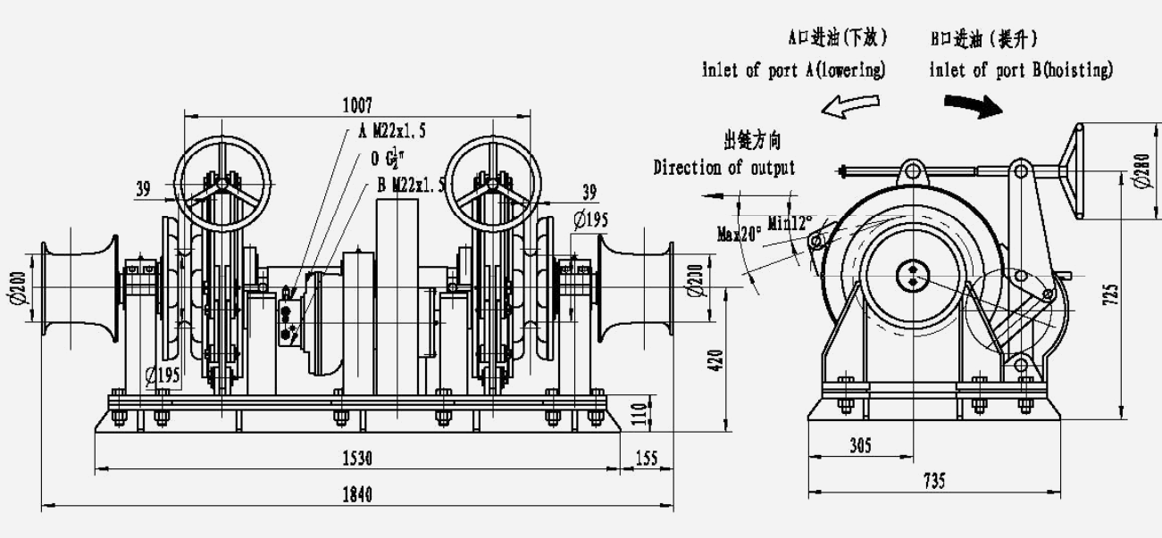 | Múnla | Ag obair ualach (KN) | Ró-ualach tarraingt (RN) | Shealbhaíochta ualach (KN) | Luas ainmniúil of windlass (m/nóim) | Ancaireacht | Iomlán díláithriú (mL/r) | Rátáilte Brú (mL/r) | Soláthar oi1 sreabh (L/nóim) | Slabhra trastomhas (mm) |